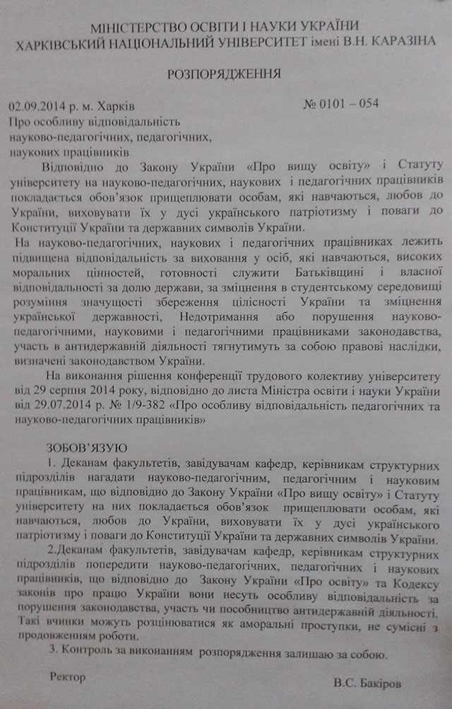 Виль Бакиров, ректор Харьковского национального университета своим распоряжением ввел запрет на инакомыслие в стенах вуза.