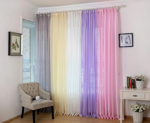 Во-первых, выбирайте цветной тюль. Игра цветов на фоне окна позволит вам выигрышно подчеркнуть свой интерьер. Особенно выигрышным будет такой вариант в комнате со светлыми однотонными стенами.