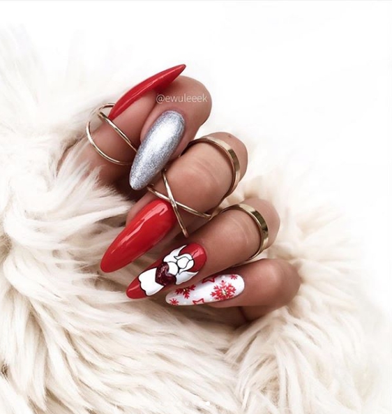 На ногтях мастера нейл-арта рисуют снежинки, зимние узоры, ёлочные украшения, мышек и других новогодних персонажей. Для оформления маникюра подходят всевозможные рисунки новогодней тематики, они очень актуальны для дизайна ногтей на Новый год.