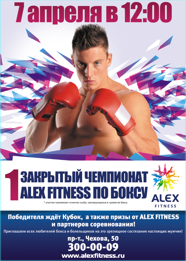 7 апреля в 12.00 в Ростове-на-Дону в фитнес-клубе ALEX FITNESS состоится I чемпионат по боксу среди клиентов клуба. Вас ждет зрелещная борьба настоящих мужчин. Справки по телефону: 300-00-09, пр-т Чехова, 50
