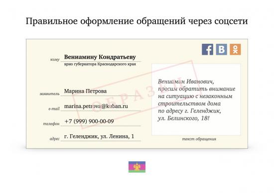 Теперь жители Кубани со своей проблемой могут обратиться к врио губернатора региона через соцсети. Накануне на страничках Вениамина Кондратьева появился образец подобного заявления.