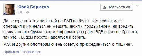 Юрий Бирюков, советник президента Украины Петра Порошенко объявил о начале спецоперации в аэропорту Донецка. Сообщение об этом появилось на личной странице Бирюкова в Facebook.