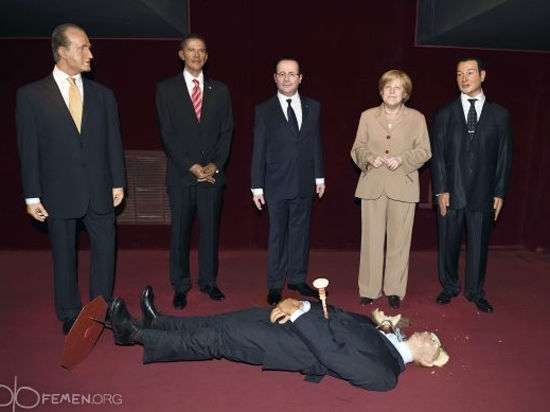 В Париже в музее Гревен, в котором все желающие могут полюбоваться восковыми фигурами мировых лидеров, активистка движения Femen напала на фигуру Владимира Путина.