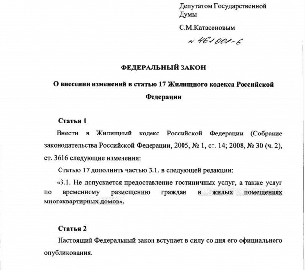 Как сообщает сайт Государственной Думы России, 26 февраля 2014 года Госдума Российской Федерации зарегистрировала законопроект, в котором говорится о запрете сдачи жилых помещений в многоквартирных домах в аренду, а также на предоставление гостиничных услуг в этих домах. На данный момент законопроект рассматривает Комитет Госдумы по жилищной политике и ЖКХ.